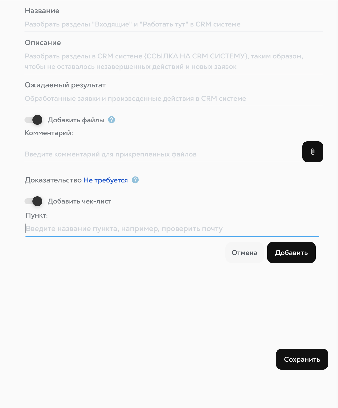 Заполните блок с названием и описанием задачи. Также можно приложить файлы, задать тип доказательства по закрытию и добавить чек-лист.