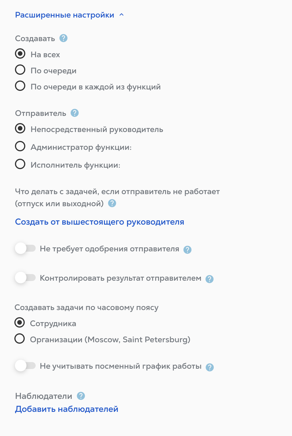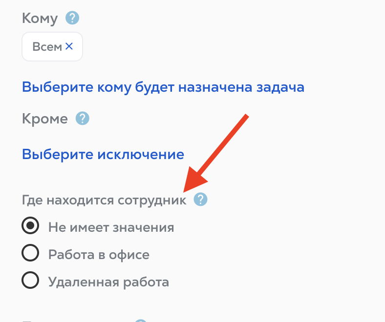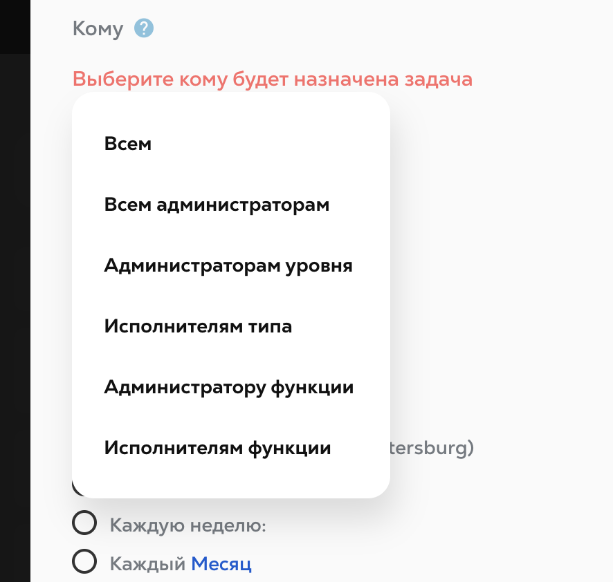 Кроме: если вы столкнулись со случаем, когда, например, повторяющаяся задача должна приходить всем администраторам функций, кроме одной, то именно здесь вы выбираете исключение.