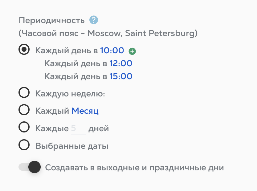 Важно: при отключенной настройке, задача, чье создание выпадает на выходной/праздничный день, создастся в последний рабочий день перед праздником.