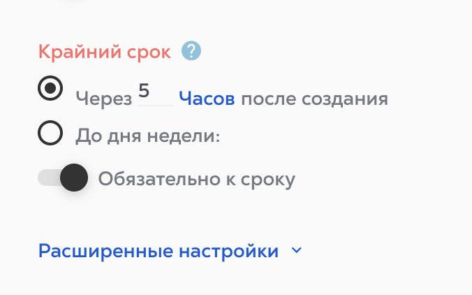 Ниже вы увидите настройку “Обязательно к сроку” и также по умолчанию “переключатель” стоит включенным. Это означает, что тот крайний срок, который вы установили будет обязательным и сотрудник, выполняющий задачу, самостоятельно его не сможет перенести. Если же эта опция отключена, то сотрудник может самостоятельно перенести крайний срок.