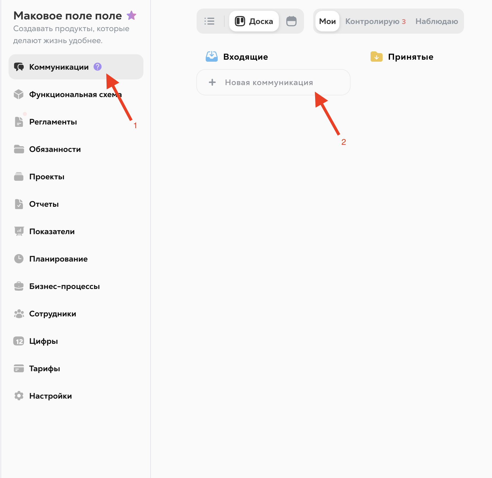 1. Открыть раздел "Коммуникации" и нажать кнопку "Новая коммуникация".