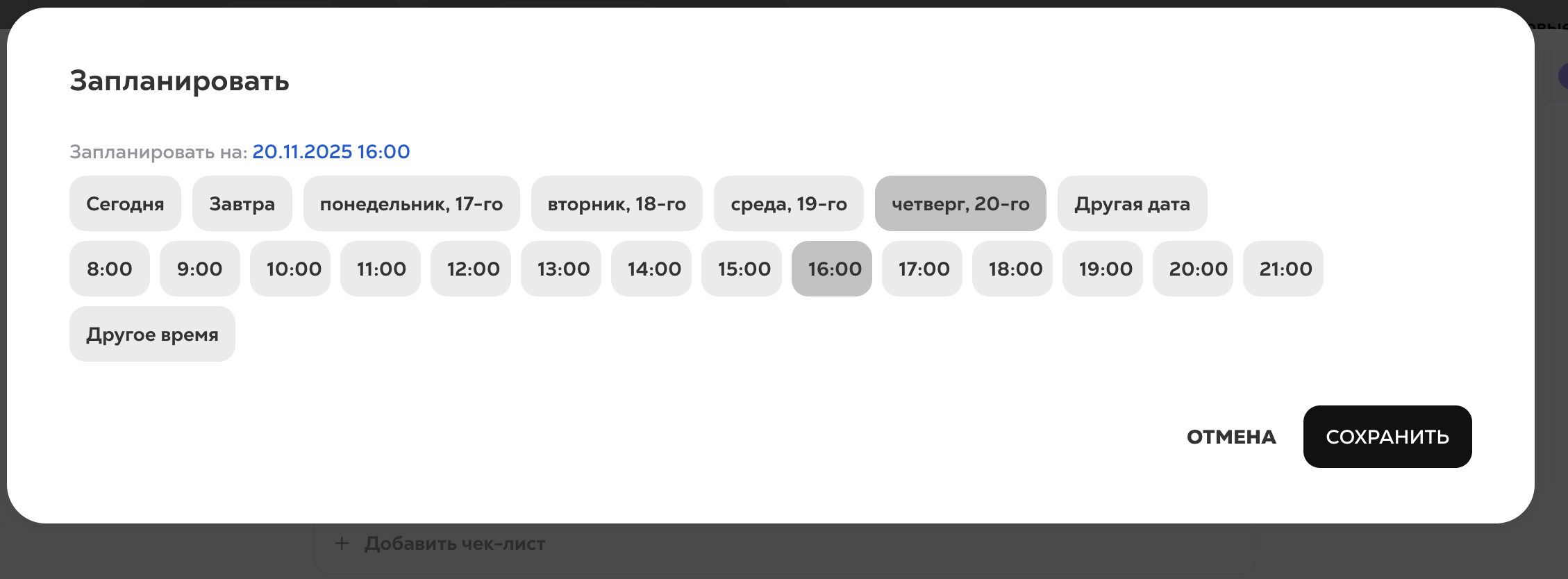 3. Запланировать дату и время создания коммуникации. Нажать кнопку “сохранить”.
